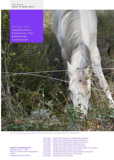 In this course, students will be introduced to a range of landscape practices that regenerate soil health and enhance biological integrity through the research of five projects in a range of climatic and geographical conditions. Each project is a Garden of the 21st Century, a collection of field sites within the Chair of Being Alive that are located in Switzerland, Spain, Chile, and the United States. Through the lens of each Garden, traditional and pioneering approaches in designing with living systems will be critically discussed, including adaptive grazing, water harvesting, afforestation, soil building, and agroforestry. An introduction to these strategies will enable students to learn about key parameters for designing landscapes with the goal of regeneration, as well as gain perspective on ecological topics including succession, disturbance, and management. Additionally, the course will examine the potentials and challenges of these practices to influence landscapes at a territorial scale.